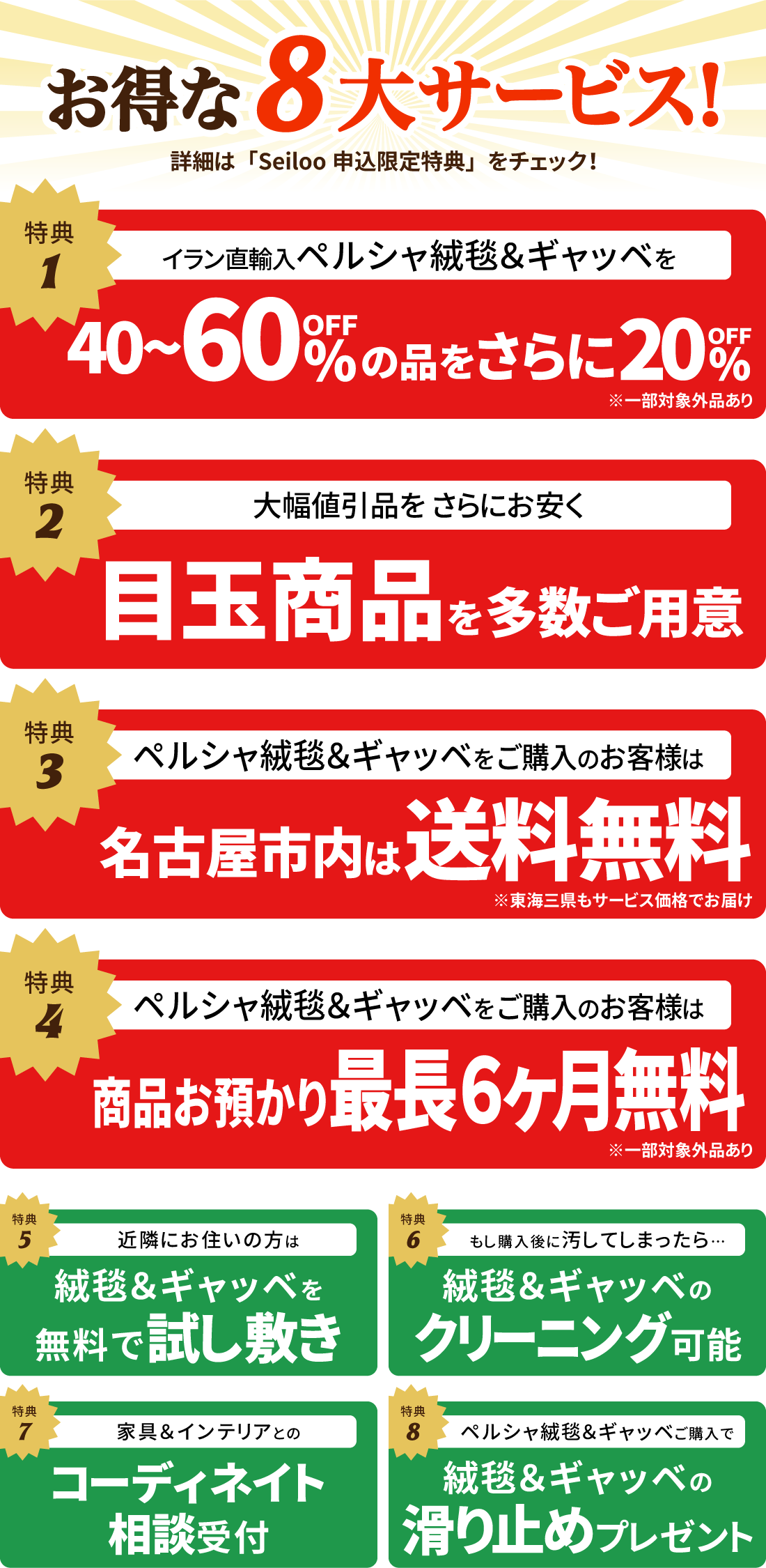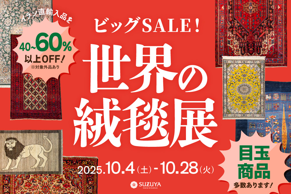 『ビッグSALE!世界の絨毯展』は、10月4日(土)からインテリア販売会ポータルサイト『SEILOO』にて開催いたします。このチャンスをどうぞお見逃しなく!!