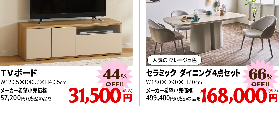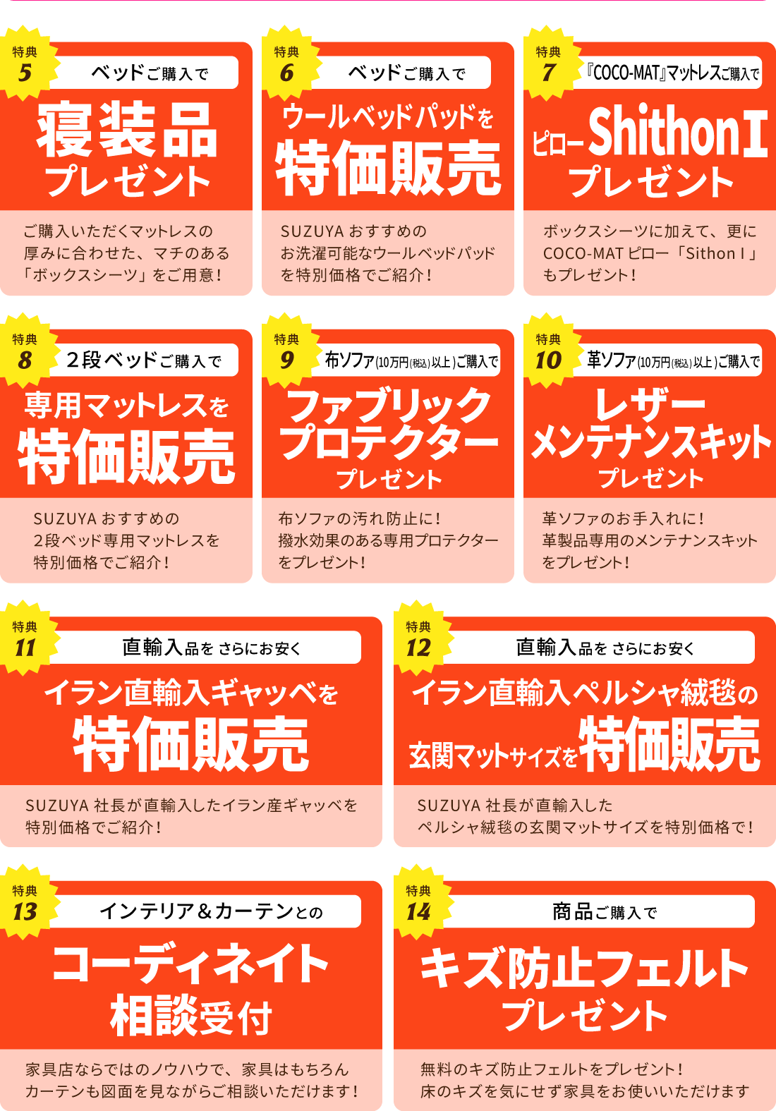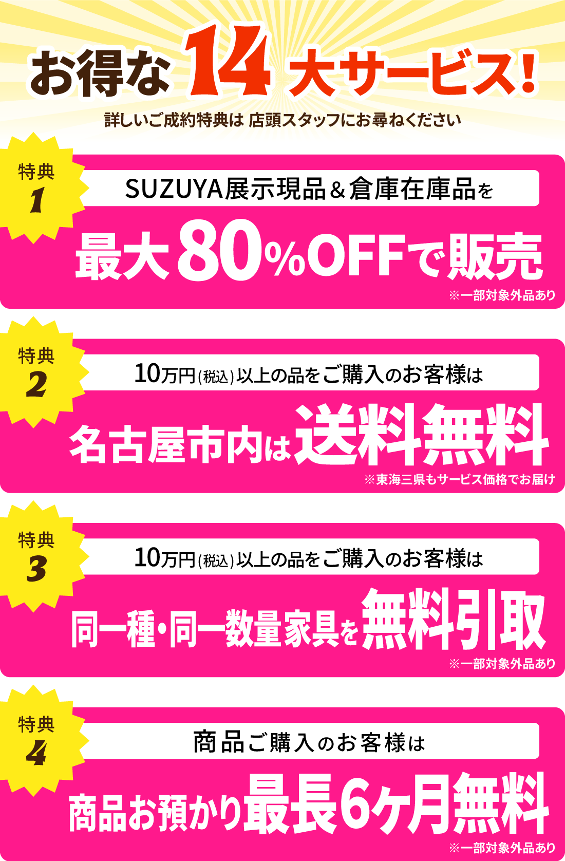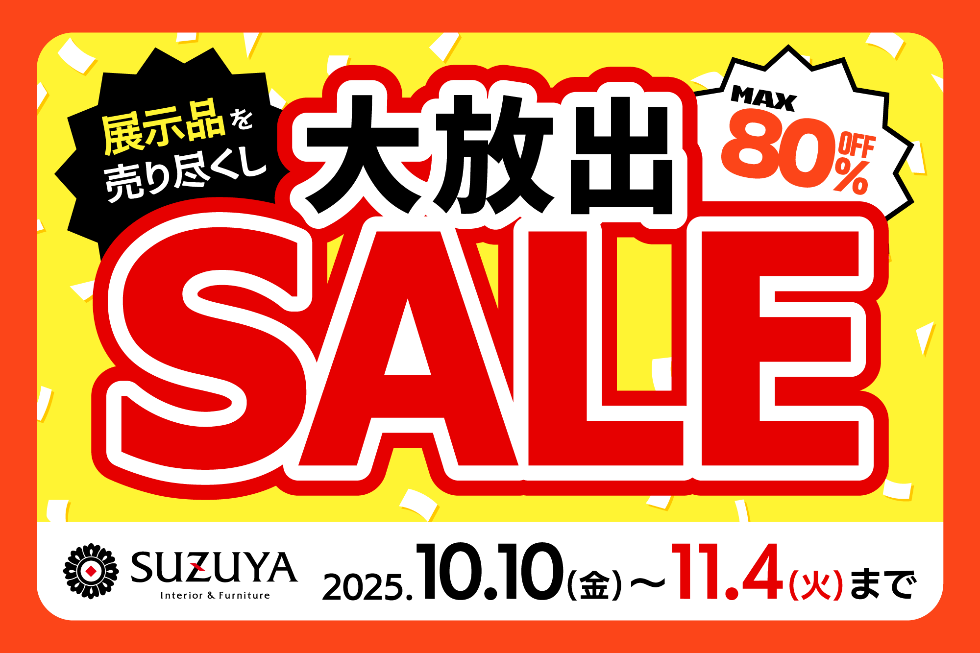今回のイベントは、店頭にて販売している展示現品&倉庫在庫品を大幅値引きする売り尽くしセールです。ダイニングやリビング、寝室、玄関に至るまで、SUZUYAがおすすめする魅力的な商品を一挙大放出いたします!