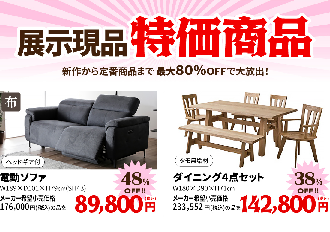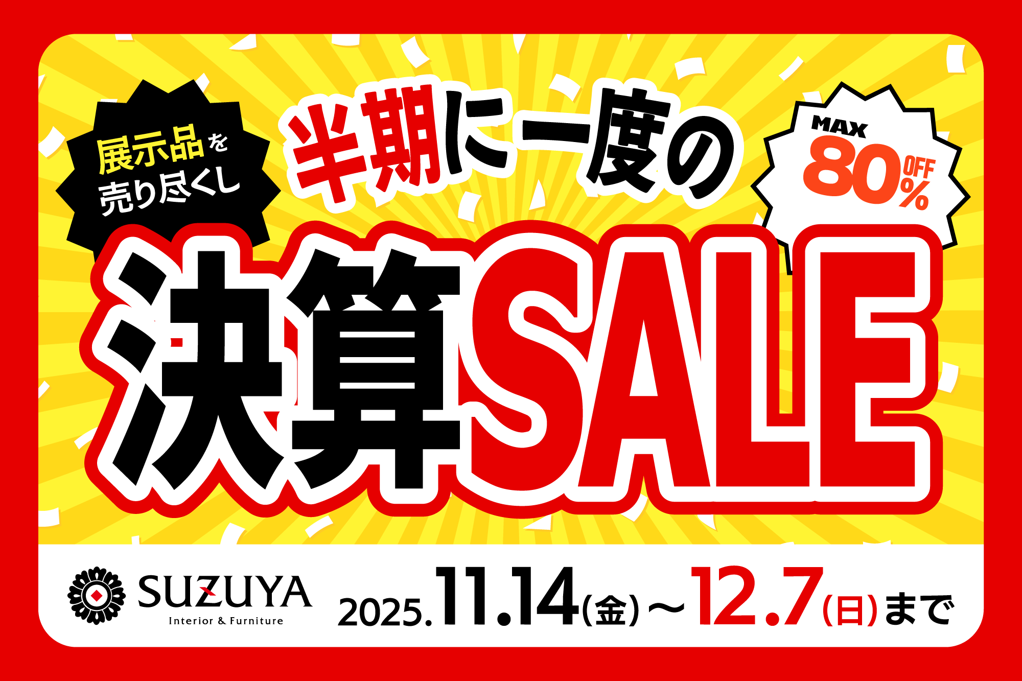 今回のイベントは、店頭にて販売している展示現品&倉庫在庫品を大幅値引きする売り尽くしセールです。ダイニングやリビング、寝室、玄関に至るまで、SUZUYAがおすすめする魅力的な商品を一挙大放出いたします!